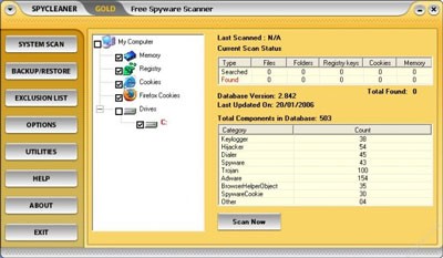 Free Spyware Scanner có khả năng quét trong bộ nhớ, Registry, các Cookies do trình duyệt tạo ra và lưu trữ, cũng như toàn bộ ổ cứng của hệ thống.