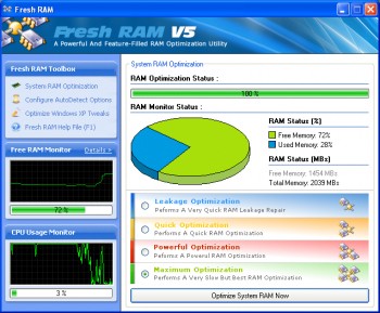 Giao diện chính của Fresh RAM hiển thị mức độ sử dụng bộ nhớ RAM và CPU hiện tại của hệ thống. Phần mềm cung cấp 4 cấp độ tối ưu hóa bộ nhớ RAM: