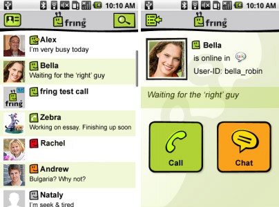 Fring nhanh chóng đồng bộ danh bạ từ sổ địa chỉ của bạn, cho phép bạn dễ dàng lựa chọn người để trò chuyện, gọi điện hoặc thực hiện cuộc gọi video. Khả năng gọi video phụ thuộc vào tốc độ xử lý của thiết bị và việc dịch vụ chat bạn sử dụng có hỗ trợ tính năng này hay không.