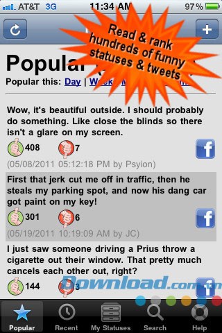 Người dùng có thể thoải mái đọc và đánh giá hàng ngàn trạng thái Facebook vui nhộn được đăng tải từ trước đến nay.