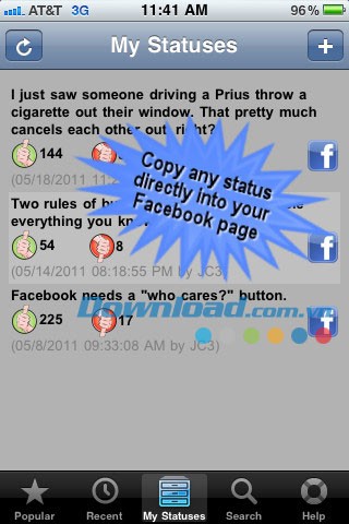 Phần mềm này tổng hợp những dòng trạng thái Facebook cực kỳ hài hước, được chia sẻ bởi cộng đồng người dùng Facebook trên khắp thế giới.