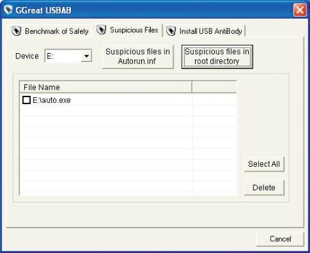 Để tìm và loại bỏ các virus autorun, bạn chuyển sang tab Suspicious File và nhấn nút AutoRun suspicious file. Sau khi quá trình quét hoàn tất, chương trình sẽ hiển thị danh sách các tập tin nghi ngờ. Hãy đánh dấu chọn vào những tập tin được xác định là virus và nhấn nút Delete để xóa chúng khỏi USB.