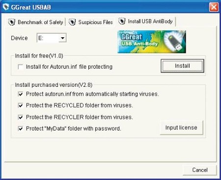 Để tăng cường bảo vệ USB khỏi các cuộc tấn công của virus autorun, hãy chọn tab Install USB AntiBody. Tại đây, tích vào ô Install for AutoRun.inf file protecting và nhấn nút Install. GGreat USB AntiBody sẽ tạo các tập tin bảo vệ trên USB, được mã hóa chặt chẽ và không thể xóa bỏ, ngăn chặn virus lây lan.