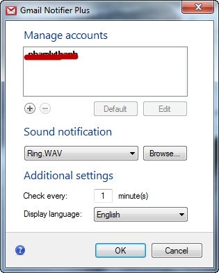 Tiếp theo, chọn Browse… ở mục Sound notification và chọn file Ring.WAV từ thư mục giải nén để làm âm thanh báo thư mới. Ở ô Check every… minute(s), bạn nên để mặc định là một phút để kiểm tra thư liên tục.