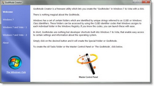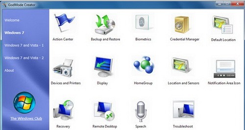 GodMode Creator cung cấp khả năng tạo ra tới 38 GodMode khác nhau cho cả Windows 7 và Windows Vista chỉ với vài thao tác đơn giản. Trong đó, riêng Windows 7 đã có sẵn 14 GodMode, còn lại được hỗ trợ trên cả hai nền tảng.