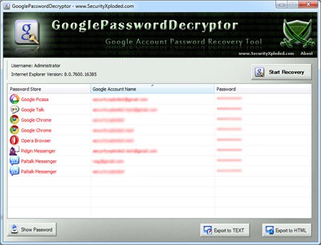 Công cụ này sẽ tiến hành quét qua các ứng dụng đã cài đặt và tiến hành giải mã các mật khẩu tài khoản Google được lưu trữ. Google áp dụng một hệ thống mật khẩu tập trung để quản lý toàn bộ các dịch vụ của mình, bao gồm Gmail, Picasa, GTalk, iGoogle và Desktop Search.