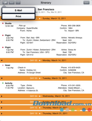 Xem và chỉnh sửa thông tin chi tiết của chuyến đi, tích hợp với lịch điện tử trong ứng dụng, đồng thời chia sẻ qua email dưới dạng file PDF đính kèm.