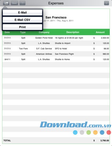 Truy cập thông tin chi tiết về chi phí du lịch (thuế, phí dịch vụ...). Chuyển đổi chi phí sang 29 đơn vị tiền tệ. In bảng tính chi phí hoặc gửi qua email tới văn phòng để thanh toán công tác phí.