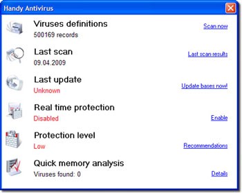 Làm thế nào để cập nhật Handy Antivirus? Bạn có thể cập nhật cơ sở dữ liệu virus chỉ bằng một cú nhấp chuột trên thanh điều khiển.