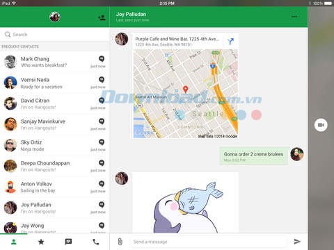 Tính năng trò chuyện nhóm trong Hangouts for iOS đã được cải thiện đáng kể. Bạn có thể chia sẻ hình ảnh, sử dụng các biểu tượng cảm xúc, theo dõi trạng thái trực tuyến của bạn bè và gửi tin nhắn ngay cả khi họ không online.