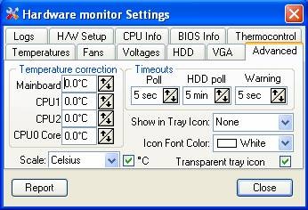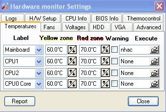 Để thiết lập cảnh báo, điều chỉnh ngưỡng nhiệt độ, hoặc tự động tắt máy khi nhiệt độ vượt quá giới hạn, bạn chỉ cần nhấp vào biểu tượng của chương trình trên khay hệ thống và chọn Settings. Cửa sổ Hardware Monitor Settings sẽ cung cấp các tùy chọn chi tiết thông qua các tab sau: