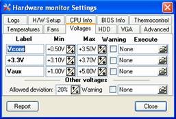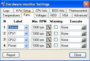 Tab này cho phép bạn điều chỉnh tốc độ làm mát của các quạt trong thùng máy. Bạn cũng có thể bật cảnh báo nếu tốc độ quạt giảm xuống dưới mức quy định bằng cách đánh dấu chọn các dòng trong mục Warning và chọn file âm thanh cảnh báo tương ứng trong mục Execute. Thông thường, tốc độ quạt trung bình dao động khoảng 4.800 vòng/phút, tùy thuộc vào loại mainboard và cấu hình của bạn.
