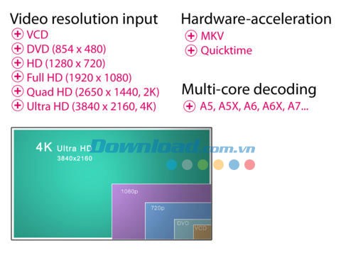 Hỗ trợ xem video MKV với độ phân giải cao 2K (2560 x 1440) và 4K (3840 x 2160) trên các thiết bị iPhone 5S, iPad Air và iPad Mini Retina.