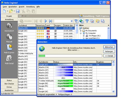 Phần mềm Hello Engines được thiết kế chuyên biệt để cung cấp thông tin về website của bạn đến các công cụ tìm kiếm hàng đầu (ví dụ: AltaVista, Fireball, v.v.) và các thư mục lưu trữ quan trọng (ví dụ: Yahoo, Web.de, v.v.) một cách nhanh chóng, chính xác và tin cậy.