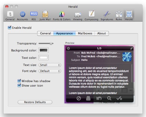 Herald là một tiện ích mở rộng thông báo được thiết kế dành riêng cho ứng dụng Mail, ứng dụng email mặc định của hệ điều hành Mac OS X từ Apple. Chức năng chính của Herald là hiển thị các thông báo pop-up mỗi khi bạn nhận được email mới.