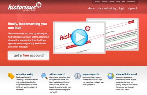 Historious là một công cụ lưu địa chỉ web trực tuyến, hoạt động tương tự như các dịch vụ bookmark khác hiện có. Tuy nhiên, điểm khác biệt nổi bật của Historious nằm ở khả năng sao lưu toàn bộ trang web khi bạn đánh dấu (bookmark).