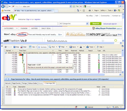 Để kiểm tra, chúng tôi mở một tab mới, truy cập một trang web và chọn HTTPWatch Basic từ menu Tools. Giao diện của tiện ích sẽ xuất hiện ở phần dưới của cửa sổ Internet Explorer.