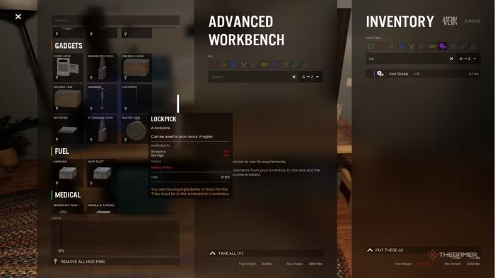 Lockpick có thể bị hao mòn trong quá trình sử dụng. Do đó, việc tự mình chế tạo chúng là một giải pháp tối ưu. Để thực hiện, người chơi cần chuẩn bị những thứ sau: