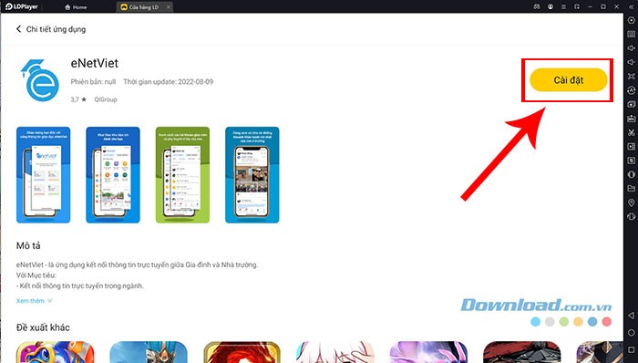 Bước 4: Chọn vào biểu tượng ứng dụng eNetViet để chuyển đến trang Chi tiết ứng dụng. Sau đó, bấm vào nút Cài đặt.