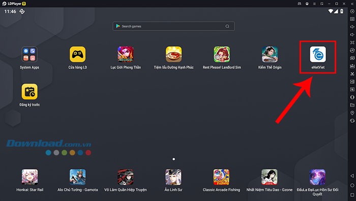 Sau khi hoàn tất quá trình cài đặt, ứng dụng eNetViet sẽ xuất hiện trên giao diện của trình giả lập LDPlayer 9. Người dùng chỉ cần thực hiện thao tác nhấp đúp chuột để khởi động ứng dụng.