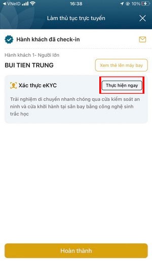 Bước 7: Sau khi hoàn thành check-in online trên ứng dụng của hãng hàng không, chọn Xem thẻ lên máy bay, sau đó chọn Xác thực eKYC và nhấn Thực hiện ngay để xác minh danh tính.