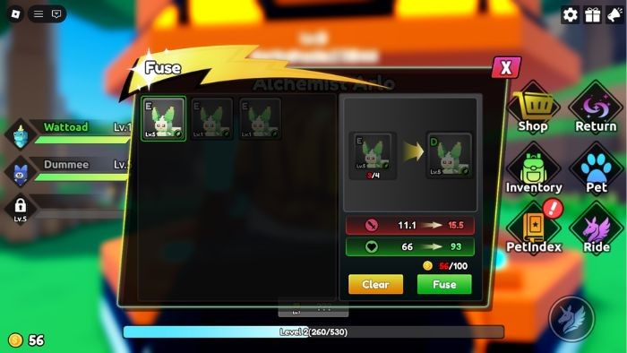 Khi sở hữu nhiều bản sao của cùng một loại thú cưng, bạn có thể tiến hành hợp nhất chúng. Hãy tìm và tương tác với NPC Fusion gần điểm xuất phát để truy cập menu hợp nhất. Bạn cần tối thiểu 4 bản sao của thú cưng muốn nâng cấp và một lượng tiền xu nhất định. Quá trình hợp nhất sẽ cải thiện các chỉ số của thú cưng, nhưng không làm tăng cấp độ của chúng.