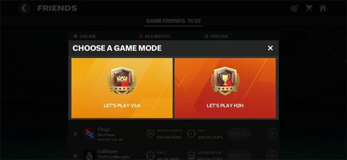 Điều kiện tiên quyết là cả hai người chơi phải trực tuyến đồng thời trong FC Mobile. Một trong hai người có thể bắt đầu bằng cách chọn "Match" cạnh tên bạn bè trong danh sách, sau đó lựa chọn chế độ chơi mong muốn (VS Attack hoặc H2H) và gửi lời mời.