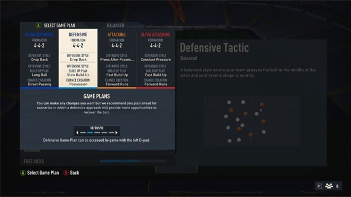 Trong chế độ Career Mode hoặc Ultimate Team, việc lựa chọn đội hình và chiến thuật đóng vai trò vô cùng quan trọng. Người chơi nên tùy chỉnh 4 thiết lập kỹ thuật cơ bản, gán cho các phím D-pad trái và phải để dễ dàng điều khiển.