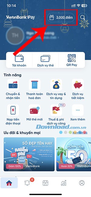 Bước 2: Chọn vào biểu tượng quà tặng, nơi hiển thị số điểm hiện có của bạn.