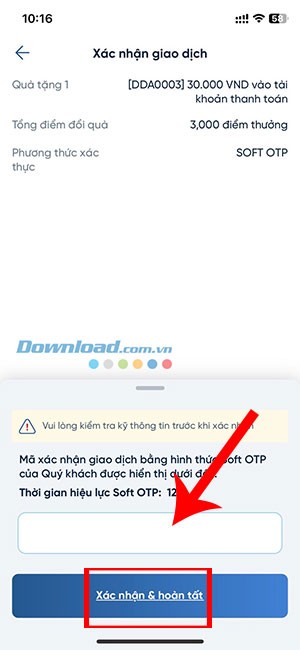 Bước 6: Nhập OTP hoặc Soft OTP vào cửa sổ Xác nhận giao dịch. Chọn Xác nhận & hoàn tất để hoàn tất việc sử dụng điểm thưởng tích lũy để đổi quà.