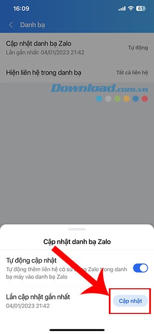 Bước 6: Bấm vào nút Cập nhật để tiến hành đồng bộ hóa danh bạ điện thoại hiện tại lên ứng dụng Zalo.