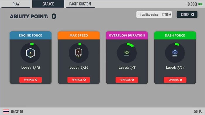 Sau khi mua xe, người chơi có thể nâng cấp hiệu suất xe bằng cách sử dụng Ability Points. Các thuộc tính có thể được cải thiện bao gồm: