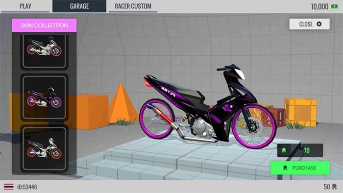 Người chơi sẽ được cung cấp miễn phí chiếc MOI 110 để làm quen với trò chơi. Bên cạnh đó, xe CR 135 cũng có thể được mua với giá 0 xu. Để sở hữu những chiếc xe khác, người chơi cần tích lũy xu thông qua việc tham gia các cuộc đua và hoàn thành nhiệm vụ.