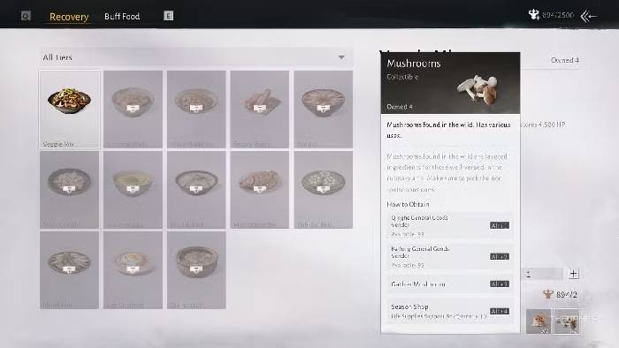 | Wine Mushrooms | 41 | 3 Mushrooms, 3 Meat Scrap | Hồi 22.500 HP trong 3 giây | 4 | Mua tại Meow Meow Temple Shop - Kaifeng. |
