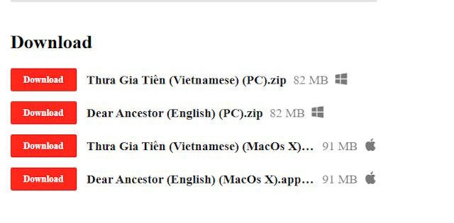 Bước 3: Hiện tại, game Thưa Gia Tiên cung cấp 4 phiên bản khác nhau: Dành cho máy tính PC và MacOS, cùng với hỗ trợ ngôn ngữ tiếng Anh và tiếng Việt. Hãy chọn phiên bản phù hợp với thiết bị của bạn và nhấn vào nút Download.