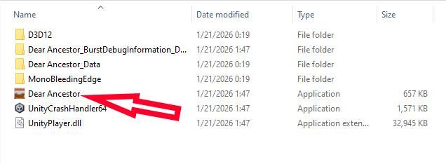 Chạy file thực thi của game, có tên là Dear Ancestor (loại file là "Application"), để bắt đầu trải nghiệm trò chơi mà không cần thực hiện cài đặt phức tạp.