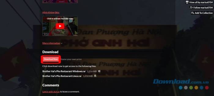 Bước 1: Truy cập trang web chính thức của Brother Hai's Pho Restaurant trên nền tảng itch.io (). Bạn sẽ được chuyển hướng đến trang tải game Brother Hai's Pho Restaurant. Hãy chọn và nhấn vào nút Download Now để bắt đầu quá trình tải.