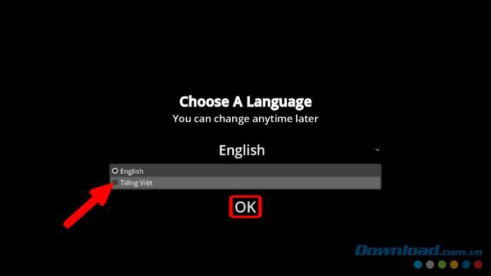 Bước 6: Một cửa sổ lựa chọn ngôn ngữ sẽ hiện ra. Hãy chọn Tiếng Việt và nhấn OK để trải nghiệm game bằng ngôn ngữ quen thuộc.