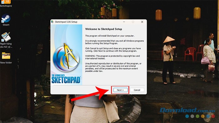 Bước 4: Chọn Yes để xác nhận việc bắt đầu cài đặt, sau đó nhấn nút Next trong cửa sổ Sketchpad 5.06 Setup.