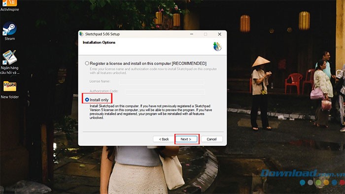 Bước 6: Lựa chọn Register a license and install on this computer để đăng ký bản quyền và cài đặt phiên bản đầy đủ của Geometer’s Sketchpad. Hoặc, bạn có thể chọn Install only để trải nghiệm bản dùng thử. Sau khi quyết định, nhấn Next.