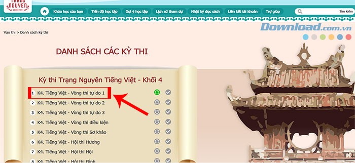 Bước 2: Trong giao diện hiện tại, chọn một bài thi đã được cung cấp, ví dụ như K4. Tiếng Việt - Vòng thi tự do 1 (biểu tượng có màu xanh lá cây).