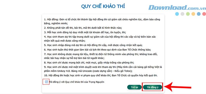 Bước 3: Đọc cẩn thận toàn bộ Quy chế khảo thí để hiểu rõ các quy định của cuộc thi. Tiếp theo, đánh dấu vào ô Tôi đồng ý với Quy chế Khảo thí và nhấn nút Tôi đồng ý.