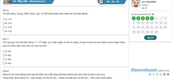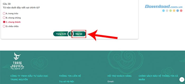 Bước 5: Sau khi kết thúc bài thi, nhấn nút Nộp bài ở cuối bài hoặc tại khu vực hiển thị số lượng câu hỏi đã trả lời.