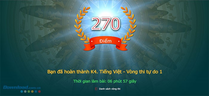 Bước 7: Một thông báo xác nhận hoàn thành kỳ thi, cùng với điểm số đạt được và thời gian làm bài, sẽ được hiển thị. Đến đây, học sinh đã hoàn tất vòng thi tự do của Trạng Nguyên Tiếng Việt 2023-2024.