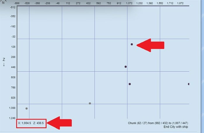 Khi di chuột qua, tọa độ của End City cụ thể đó sẽ xuất hiện ở góc dưới cùng bên trái của bản đồ. Sử dụng các tọa độ này để điều hướng đến vị trí của End City trong trò chơi hoặc dịch chuyển tức thời đến đó.