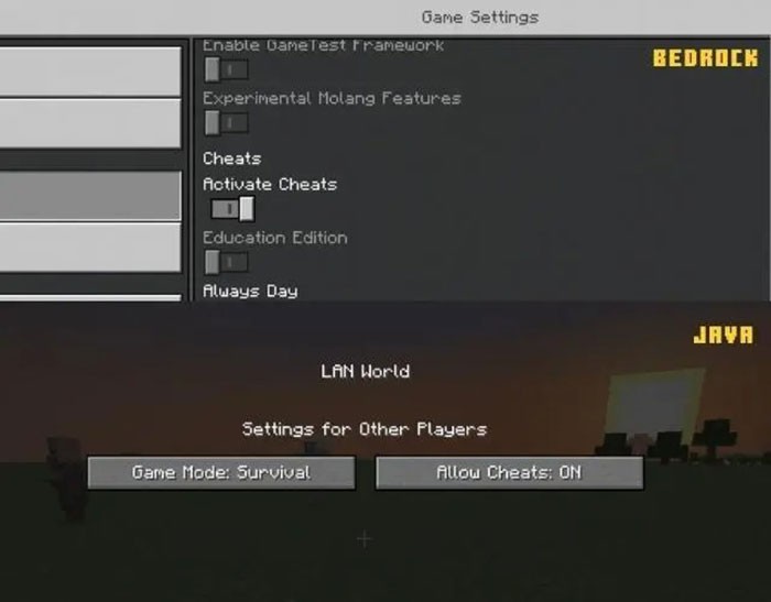 Bước 1: Đầu tiên, kích hoạt cheat code trong thế giới Minecraft bằng cách chuyển đổi Activate Cheats trong World Settings (phiên bản Minecraft Bedrock) hoặc Allow Cheats trong cài đặt LAN World (phiên bản Java).