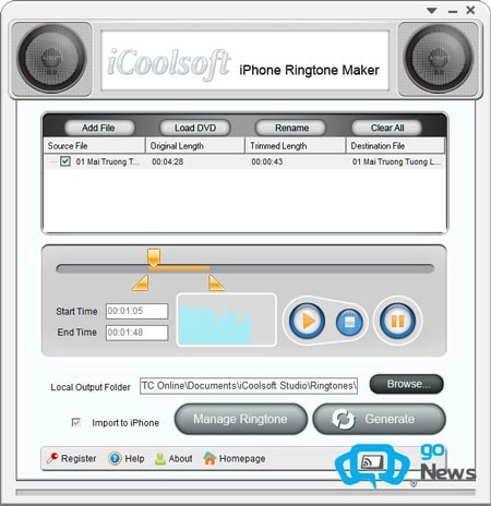Để tạo nhạc chuông iPhone, chọn file nhạc, điều chỉnh điểm bắt đầu và kết thúc bằng thanh trượt hoặc nhập thời gian tại Start Time và End Time. Nghe thử nhạc chuông bằng nút [Play]. Chọn thư mục lưu và đánh dấu tùy chọn Import to iPhone để chuyển nhạc chuông sang iPhone ngay sau khi tạo.