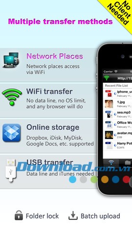 - Ứng dụng cung cấp đa dạng các phương thức truyền tải dữ liệu. Người dùng có thể lựa chọn chuyển file qua kết nối WiFi, USB, hoặc thông qua các dịch vụ lưu trữ đám mây phổ biến như Dropbox, iDisk (MobileMe), Google Docs, myDisk...