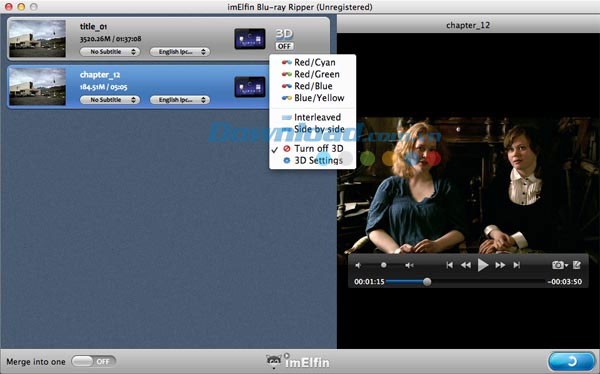 Chuyển đổi Blu-ray/DVD 2D sang video 3D chỉ với một cú nhấp chuột. Phần mềm hỗ trợ 6 loại hiệu ứng 3D: Red/Cyan, Red/Blue, Red/Green, Blue/Yellow, Interleaved và Side by Side.
