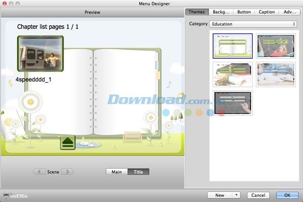 Nhấn nút "" ở góc dưới bên phải giao diện chính để mở cửa sổ Menu Designer. Tại đây, bạn có thể tùy chỉnh chủ đề, nút Play, hình nền, chú thích, số lượng chương và các yếu tố khác của menu DVD. Bạn cũng có thể trang trí menu DVD bằng các hình ảnh từ iPhoto hoặc iTunes.